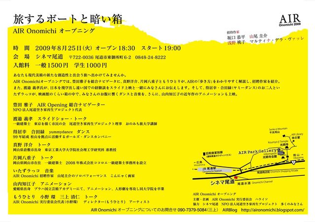 旅するボートと暗い箱 AIR Onomichiオープンニングパーティー http://aironomichi.blogspot.com/ 時間 2009年8月25日 1830オープン 19:00スタート 場所 シネマ尾道 http://www.cinema-onomichi.com/ 入場料 1500円 学生1000円 《演者》 総合ナビゲーター/豊田雅子 トークゲスト/渡辺義孝 真野洋介 片岡八重子 もうひとり(小野環 三上清仁) パフォーマンス/いたずラっコ(山尾圭介) ヤミーダンス(得居幸 合田緑) アニメーション/山内知江子 スペシャルゲスト/多田ケイキ 多田順子 《企画者》ハライソ吉崎健太