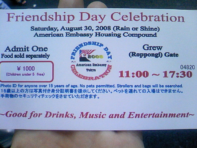 アメリカ大使館宿舎のFriendship Partyのイベントトピックです。 情報交換やイベント交流に当イベントトピックを御利用下さい。 例年、アメリカ独立記念日の7月4日前後の開催でしたが、昨年はサミット関係により8月30日に開催されました 先程。電話で確認したところ、今年は8月29日(土)開催だそうです。 台風等の悪天候の場合、9月5日に順延。 会場:アメリカ大使館宿舎(東京都港区六本木2-1) ・六本木一丁目駅(南北線)徒歩約7分 ・六本木駅(大江戸線)徒歩約7分 ・赤坂駅(千代田線)徒歩約10分