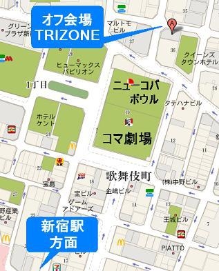 【開催日】 8月29日(土) 【開催場所】 『新宿 TRI ZONE』 http://www.trizone-live.com/ 東京都新宿区歌舞伎町2-36-5 清建ビル3F 03-3207-0651 JR新宿駅東口徒歩7分/西武新宿駅徒歩3分 新宿駅東口を出て正面にアルタビジョンが見えます。 その左手方向に青果店があるので、その前の道を 歌舞伎町方面にまっすぐ歩いていきます。 その先の信号を渡って ドン・キホーテ、マクドナルド