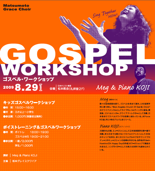日本ゴスペル界の大御所、Meg & Piano KOJIを迎えてのワークショップ。