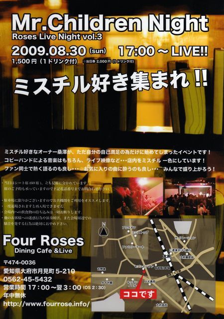 8/30¡ÊÆü¡Ë¤Ë¡¢JRÂçÉܱض᤯¤ÎDining CafeŽ¢Four RosesŽ£¤Ç¡¢ ¥ß¥¹¥Á¥ë¹¥¤¤Ë¤è¤ë¥ß¥¹¥Á¥ë¥³¥Ô¡¼LIVE¤¬¤¢¤ê¤Þ¤¹ ¤³¤Î¤ªÅ¹¤Ï¡¢¥ª¡¼¥Ê¡¼¤µ¤ó¤¬¥ß¥¹¥Á¥ë¤¬¹¥¤¤ÊÊý¤Ê¤Î¤ÇËè·îÂèÆó¡¢Âè»ÍÌÚÍËÆü¤Ï¡¢¤ªÅ¹¤Ç¥é¥¤¥ÖDVD¤òÂç²èÌ̤Ǹ«¤»¤Æ¤¯¤ì¤ë¤È¤¤¤¦Ž¢¥ß¥¹¥Á¥ë¥Ê¥¤¥ÈŽ£¤È¤¤¤¦¤â¤Î¤ò¤ä¤Ã¤Æ¤¤¤Þ¤¹ º£²ó¤ÏŽ¢¥ß¥¹¥Á¥ë¥Ê¥¤¥ÈŽ£¤Î³ÈÂçÈÇ¥³¥Ô¡¼¥Ð¥ó¥É£²ÁȤ¬¥¹¥Æ¡¼¥¸¤Ë¾å¤¬¤ê¤Þ¤¹¡ª ¥ß¥¹¥Á¥ë¹¥¤¤ÊÊý¡ª¡ª¤¼¤Ò¸«¤ËÍè¤Æ²¼¤µ¤¤ ¤ªÍ§Ã£¤â¤É¤ó¤É¤ó¸Æ¤ó¤Ç¤â¤é¤Ã¤Æ¤¤¤¤¤Ç¤¹¤è ¡Ú³«ºÅÆü»þ¡Û 8/30(ÆüÍËÆü) PM6¡§30¡Á ¢¨¤ªÅ¹¤ÏPM5:00¤«¤é¤ä¤Ã¤Æ¤¤¤Þ¤¹