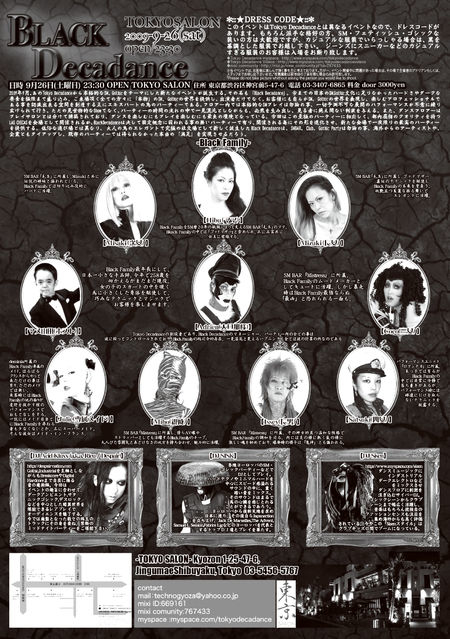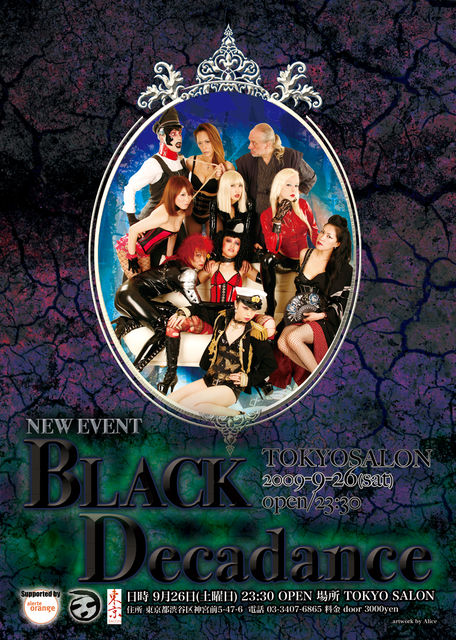 +★+:Black Decadance:+★+ 日時 9月26日(土曜日)23:30 OPEN 場所 LAS CHICAS -東京サロン- 住所 東京都渋谷区神宮前5-47-6 電話 03-3407-6865 料金 door 3000yen ---†:Black Decadance:†--- 2009年9月、あのTokyo Decadanceから本格的なSM、Gothicをテーマにした新たな イベントが誕生する。 今までの日本のSM、Gothic文化に足りなかったハードさやダークな要素を極限ま で盛り込み、ご来場頂く全ての方々に「本物」のSM、Gothicの世界を提供し、出 演者だけでなく、お客様にも自らがSM、Gothicの世界を表現し、楽しむプロフェ ッ