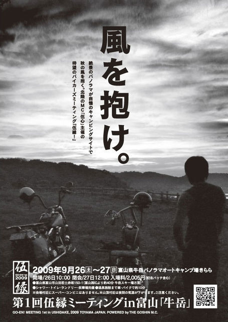 「風を抱け」第一回伍縁Meeting開催のお知らせです。 日時 2009年9月26日・27日(土・日) 場所 富山県 牛岳パノラマオートキャンプ場きらら 住所 〒930-2112 富山県富山市山田若土赤坂150-1番地 MAP http://map.mapple.net/_mdspot_sc40000_sidG01600061702_uid_lon137.060571944444_lat36.5597405555556/index.htm 会場ホームページ http://www.city.toyama.toyama.jp/yamada/shisetu/kanko/sasamine/05kirara.htm シャワー・トイレ・ランドリー・炊事場完備! バイクで走って10分位の所に温泉もあります 。