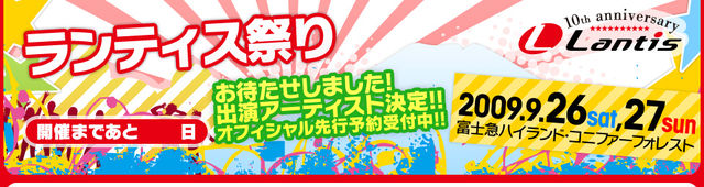 サウンドコニファー229 10周年記念ライブ「ランティス祭り」 富士急ハイランド・コニファーフォレストにて開催されるランティス祭りに、MOSAIC.WAVが参加されます。 参加は、9月26日のみになります。 5組目の出演に決まりました。 オフィシャル http://www.lantis.jp/10th/index.html http://www.soundconifer229.com/ 富士急ハイランド http://www.fujiq.jp/ ■出演者 【26日】 麻生夏子/ALI PROJECT/岩田光央/遠藤正明/小野大輔/CooRie/清水愛/JAM Project(影山ヒロノブ/遠藤正明/きただにひろし/奥井雅美/福山芳樹)/鈴