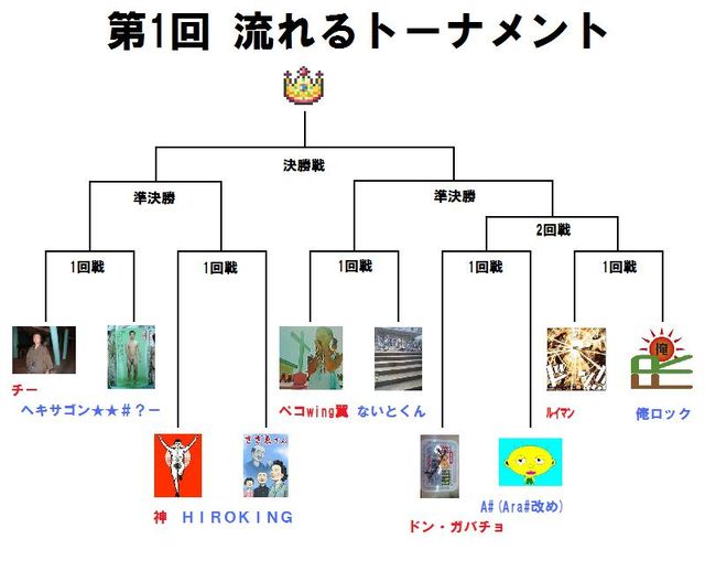 そろそろ始めたいと思います。トーナメントを作成致しますので、ご参加して下さる方は書き込みをお願い致します。  参加希望者の人数次第では、恐れ入りますが延期させて頂きます涙 受付期間: 2009年8月22日21:00〜8月25日23:59 大会開始: 2009年9月予定 〜1回戦〜 チー vs ヘキサゴン★★#?ー http://mixi.jp/view_bbs.pl?id=45789175&comm_id=4473645 神 vs HIROKING http://mixi.jp/view_bbs.pl?id=45789295&comm_id=4473645 ペコwing翼 vs ないとくん http://mixi.jp/view_bbs.pl?id=45789366&comm_id=4473645 ド