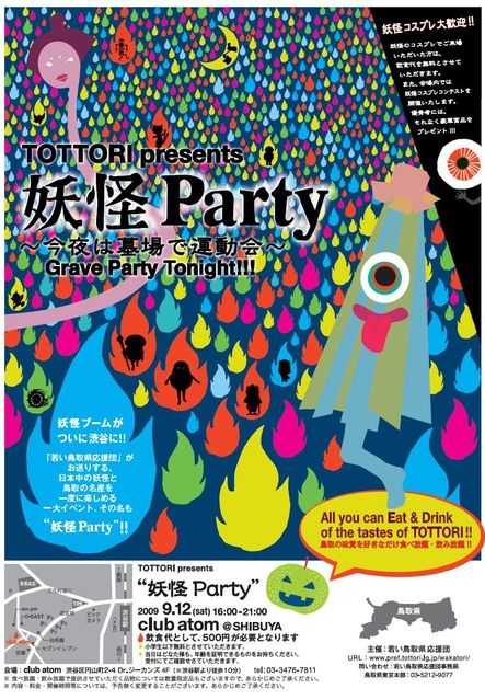 水木しげる先生の出身地、鳥取プレゼンツで 「妖怪パーティー」が行われます 日時 : 平成21年9月12日(土曜日)16〜21時 場所:Club atom(渋谷区円山町2−4 Dr.ジーカンス4F) ☆飲食代として、500円必要となります。 ・小学生以下無料 ・年齢のわかる証明書をお持ちください。 受付にて確認させていただきます。 妖怪をコンセプトに「鳥取PR」を行います。 ☆妖怪トークステージ、お笑いSHOW、地元出身歌手によるパフォーマンスあり! ☆鳥取のおいしい味覚もさまざま準備中!お食事