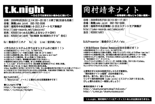 お待たせ致しました。 久々の福岡開催のお知らせです。 ナイトというか昼過ぎなのですが、充実の内容を準備しお伺いしますね! “岡村靖幸ナイトin福岡” 〜劣等感吹っ飛んじゃう熱い福岡〜 日時:9/27(日)13:00〜17:30! 会場:舞鶴juke joint 092-762-5596 住所:福岡市中央区舞鶴1-9-23エステートモア舞鶴2F http://juke-records.net/jukejoint/ 当日:\2000(1d付) DJ&Presenter:魅惑のクニオ♂/etc Show Time:スナックボギー/etc <本当のDance Chance Romanceは自分次第だぜ!> ☆岡村靖幸氏をフィーチャ