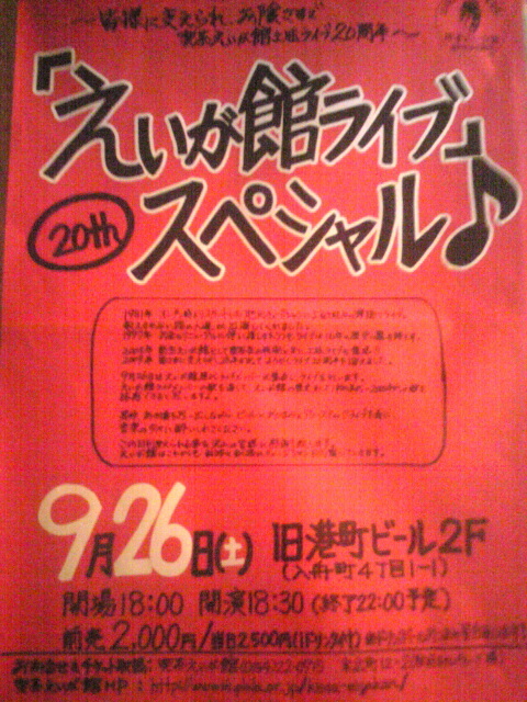 開場 18時 開演 18時半(終了22時予定) 前売り 2000円 当日 2500円 (ワンドリンク付き) *ドリンクバー&おつまみ屋台あります! お問い合わせ&チケット取り扱い 喫茶えいが館 (0154)22-0715 釧路市末広町12-2(駅前ホテルパルーデ横) 喫茶えいが館ホームページ http://www16.plala.or.jp/kissa-eigakan/ えいが館土曜ライブ20周年を祝い、えいが館歴代メンバーが集合し、ライブを行います