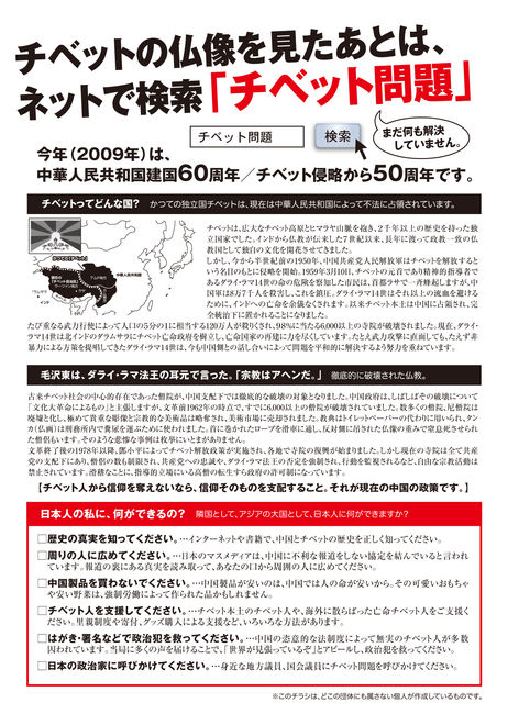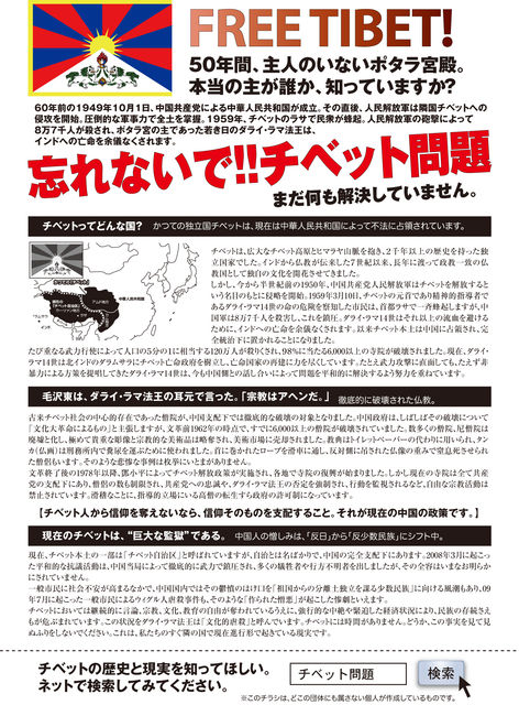 ☆抗議本トピはこちらです↓☆ 「【侵略された】聖地チベット – ポタラ宮と天空の【盗まれた】至宝 – 」展に抗議を! http://mixi.jp/view_event.pl?id=44591586&comm_id=7228 ------------------------ 上野の森美術館において開催される 「聖地チベット 〜ポタラ宮と天空の至宝〜」展に併せて、 有志を募って上野駅周辺でチラシ配りをします! 一緒にチラシ配りをしていただける方は、ぜひご参加ください。 【日程】 9月20日(日) 10:00〜18:00(担当:ジャム) 21日(敬老の日) 10:00〜18:00(担当:にゃんとも@
