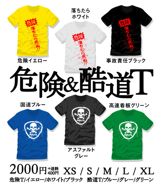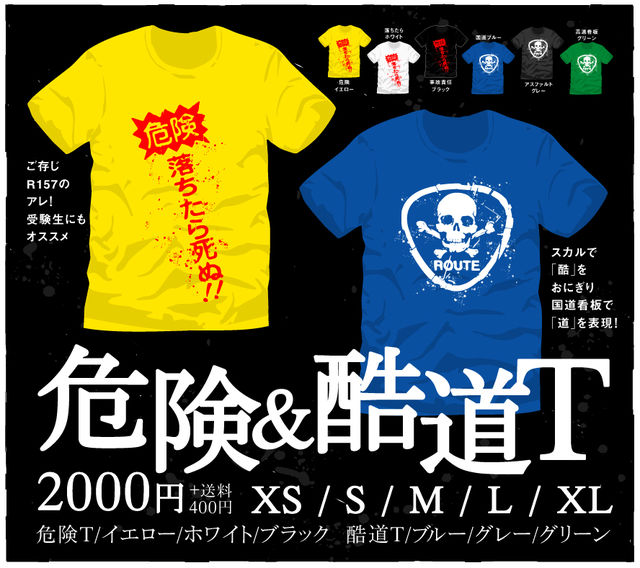 完全受注生産受付終了しました 9/12(土)23:59〆切でした オファーいただいた皆さん、ありがとうございました! 振込方法↓こちらにアップしておりますので http://mixi.jp/view_bbs.pl?id=46203648&comment_count=2&comm_id=2105047 お時間あるときにでもよろしくお願いします ---以下、リリース時の告知となります--- 【危険T&酷道T2】通販ダブルリリース! 某イベントで販売した スカルで「酷」おにぎりで「道」を表現した【酷道T/スカル】と スピンアウト企画、R157のアレ【危険T】を 通販ダブル・リリースいたします。