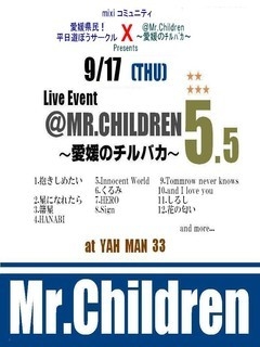 20:00時開場☆20:30開演 コミュニティのコラボとして、全員が主催者のイベントです 時 9月17日(木) 会場 YAH MAN 33 会費 2000 ワンドリンク付き アコースティックギターによるミスチルナンバーの生演奏 プラス Band act. 演出&出演 いけぽん(白檀) 佐藤 昴蒔(YAH MAN 33) @BAND & 唄うのはあなたデス ヴォーカルでの参加希望者は下さい その日、確実に参加できる方で
