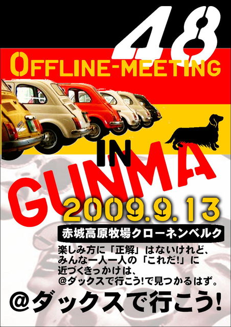 みなさんこんにちは H(^0^)E(^-^)L(^○^)L(^-^)O(^○^)ー!! この度、群馬・赤城高原牧場クローネンベルクで第48回オフ会として、群馬“初”開催を行いたいと思います!! (^−^)//"" パチパチ この群馬オフを成功させると、@ダックスで行こう!関東地区(東京・神奈川・千葉・埼玉・茨城・栃木・群馬)制覇になります 今回は、新潟や長野からもアクセスしやすい開催地ですので、どしどし参加表明してくださいね 詳細は下記の通りですので必ず最後までお読みください