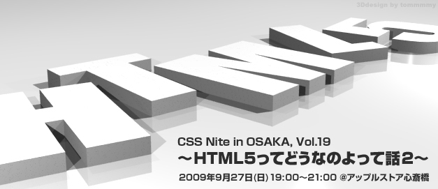 ------------------------------------------------------ CSS Nite in OSAKA, Vol.19 〜HTML5ってどうなのよって話2〜 ------------------------------------------------------ Vol.18で取り上げたHTML5のおさらいに加え、前回紹介しきれなかったネタや、新しく入った情報を紹介します。 今回の会場は3ヶ月ぶりのアップルストア心斎橋。 懇親会も予定していますので、そちらもお楽しみに! 【特設サイト】 http://osaka.cssnite.jp/vol19/ ■日時:2009年9月27日(日)19:00〜21:00 ■会場:アップルストア心斎橋 2F http: