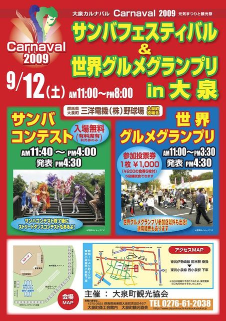 今年も大泉カルナバルが開催されます!! 参加お待ちしております! サンバフェスティバル&世界グルメグランプリ IN 大泉 場所 群馬県大泉町 三洋電機?野球場(大泉町役場北) 9/12(土)11:00-20:00 サンバコンテスト 11:30-16:00 発表16:30 入場無料(有料席あり/前売券のみ) 世界グルメグランプリ 11:00-15:30 発表16:30 参加投票券1枚 \1000 (\200の食券5枚付/5店舗試食出来ます) 問合せ 大泉町観光協会:0276-61-2038