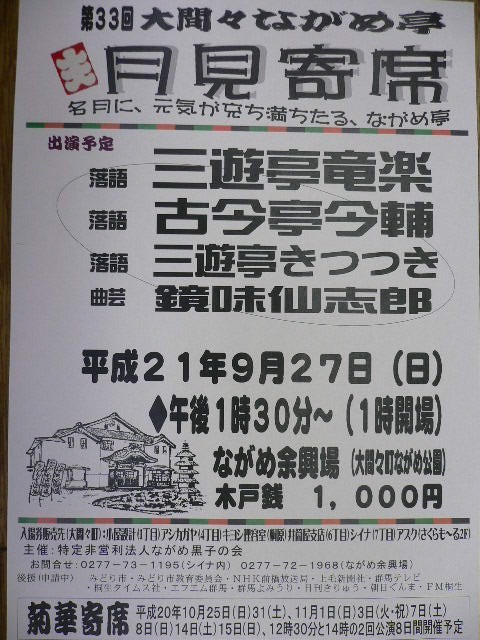 出演者 古今亭今輔(富岡市出身)・三遊亭竜楽(前橋市出身) 三遊亭きつつき(二つ目)・鏡味仙志郎(曲芸) 木戸銭 1,000円