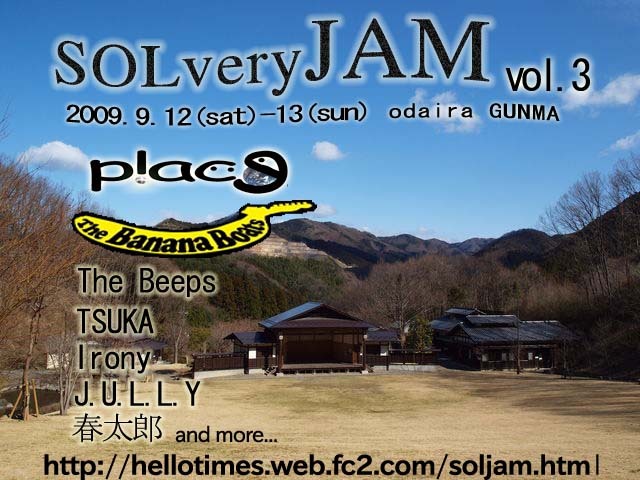 SOLveryJAM vol.3 開催決定!! 大盛況に終わったSOL JAMのvol.3が早くも決定!! 「大人の遊び」「参加型festival」のコンセプトはそのままに、 さらに進化する「SOLJAM」を目指していきます。 つきましては、SOL JAM vol.3を手伝ってくれるSTAFFを募集します。 特殊なスキルや技能は一切必要ありません。 SOL JAMを作ってみたい。こんな事をSOL JAMでしてみたい。 そんな人は是非、一緒にSOL JAM作りを手伝って下さい。 それと次回のSOL JAMをより良いものにするために、SOL JAMの良かったところ、悪かったところ、改善してもらいたい