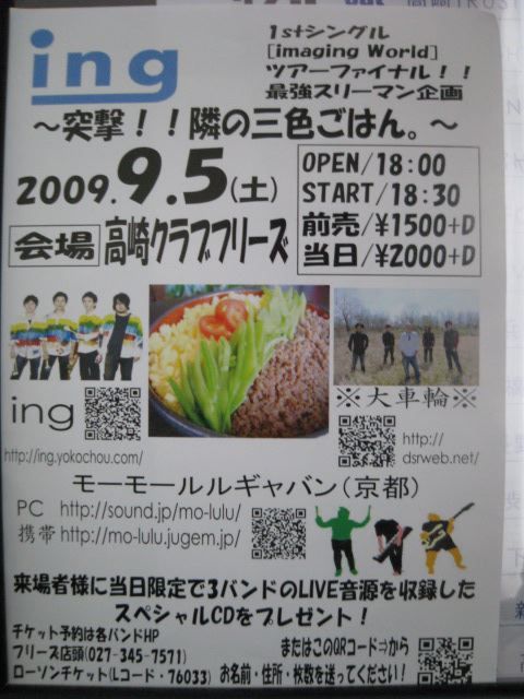 ☆9月5日(土) 高崎clubFLEEZ “imaging world TOURFINAL” 最強スリーマン企画 〜突撃!!隣の三色ごはん。〜 open→18:00 start→18:30 前売→1500+D 当日→2000+D ・モーモールルギャバン ・※大車輪※ ・ing 来場者に当日限定で3バンドのLIVE音源を収録したスペシャルCDをプレゼント!! チケット予約は ・各バンドHP ・フリーズ店頭(027-345-7571) ・ローソンチケット(Lコード・76033) ※大車輪※のHP http://dsrweb.net/ モーモールルギャバンのHP PC http://sound.jp/mo-lulu/