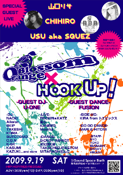 ■09/19(SAT) orange blossom × HOOK UP!! @sound space EARTH 群馬県伊勢崎市宮子町3082‐2 OPEN/21:00- ADV/3000yen(1D) DAY/3500yen(1D) ☆HIP HOP/R&B/REGGAE☆ 先着??名様にDJ MIND & DJ YUKI☆ROCK MIX CDプレゼント! -SPECIAL GUEST LIVE- 山口リサ CHIHIRO USU aka SQUEZ -GUEST DJ- U-ONE -GUEST DANCE- FUSION -DJ- NAOKI Aileron SKIP TAKESHI KOMA from デッドストック SUTOTOMO O.G.N K-SK KASUMI KAZUKI YUKI☆ROCK -LIVE- ROCKIN★KATZ 優心 デッドストック(KANESO+KOM
