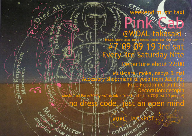 シルバーウィーク初日。 夜遊びしましょ。 no dress code, just an open mind <<about Pink Cab>> 2009年3月に生まれたMusic Taxi・Pink Cabです!いい音楽を聴きながら、踊って、お酒とか飲んで楽しくドライブ中。 Body Music〜Head Musicまで刺激的な音楽で、光の届かない深海から何万光年も離れた宇宙の果て、0から100までどこでもお連れしましょう。 Pink Cab号はみなさんのグッドバイブレーションで走ります!運行は月に一度、第3土曜日深夜にのみ。ご乗車お待ちしております。 Rid