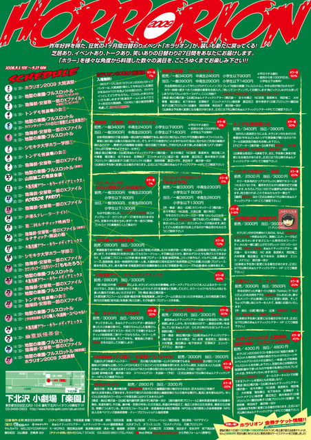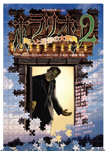 東京文化研究所presents あぁルナティックシアター 「ホラリオン2〜笑いと恐怖の大祭典〜」 こんばんは!お笑い劇団あぁルナティックシアターです。 私たちは今年の9月1日から28日の約1ヶ月間「ホラリオン2〜笑いと恐怖の大祭典〜」というイベントを行います。 38ステージにも及ぶ演目を、ホラーと笑いをテーマに毎日日替わり回替わりでお届けする一大イベント!それが「ホラリオン2〜笑いと恐怖の大祭典〜」 我々お笑い劇団あぁルナティックシアターは、不況を演劇で吹き飛ばそうとルナティックサーキットを企画しました。 ルナティ