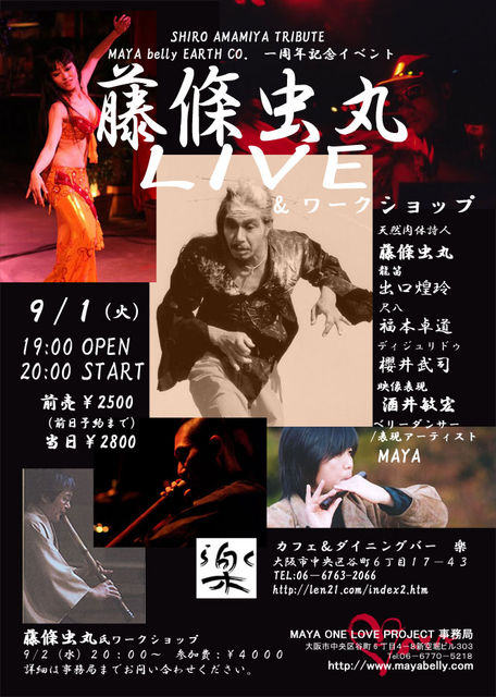 ☆MAYA BELLY EARTH COMPANY一周年記念☆ 『天然肉体詩人 藤條 虫丸 LIVEとワークショップ開催』 ◆9月1日(火) 藤條虫丸LIVE@ライブラリーカフェ『楽』 19:00 開場 20:00 開演 前売り(予約)\2500(1ドリンク代別途必要) ※前日予約まで 前売り扱い 当日 \2800(1ドリンク代別途必要) <出演> 天然肉体詩人 藤條 虫丸 尺八 福本 卓道 龍笛 出口 煌玲   ディジュリドゥ 櫻井 武司 ベリーダンス MAYA ネパールでの記念すべきLIVEを共にした天宮志龍を想い、彼の音をフューチャリングした舞いを