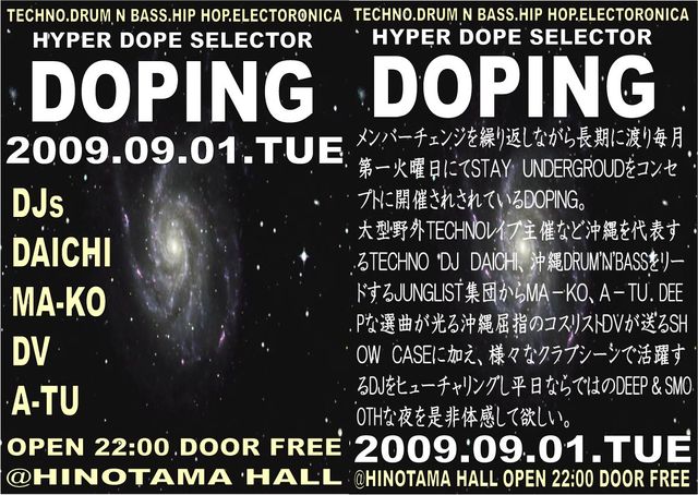 HYPER DOPE SELECTER 「DOPING」 @火の玉ホール START 22:00 FREE(入場無料) DJs DAICHI MA-KO DV A-TU TECHNO,DRUM&BASS,JUNGLE,BREAKCORE,HIPHOP,ABSTRACT,ELECTORONICA,…