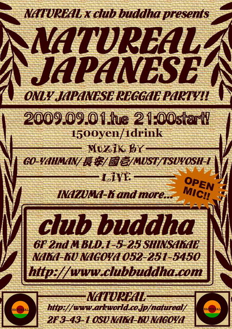 管理人様 告知失礼致します。 【NATUREAL JAPANESE】 100%JAPANESEREGGAEオンリーパーティー!! 9/1(火) 21:00〜 □選曲:JAPANESEREGGAE □LIVE:INAZUMA-K and more../OPEN MIC!! □SELECTOR:GO-YAHMAN/長安/國一/MUST/Tsuyoshi-I □料金:ADV \1500/1D,DAY \2000/1D □OPEN:21:00 START NATUREAL CREWによってセレクトされる極上のジャパニーズレゲエイベント NATUREAL JAPANESE!! JAPANESE SKA、ROOTS、DUB、DANCEHALL等 ジャパニーズレゲエの魅力をお届け致します! Rub A Dub OPENMIC有り!