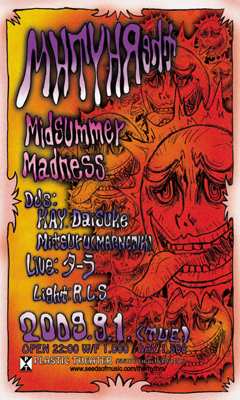 MHTYHR eht - MIDSUMMER MADNESS - ●2009.9.1. (tue) ●OPEN 22:00 ●W/F \1.000 / DAY \1.500 @Plastic Theater 札幌市中央区南5条西1丁目北1ビルB1F Tel:011−512−4847 < DJs > ・KAY ・Daisuke ・Mitsuru (MAGNETIK) < Live > ・ターラ http://homepage2.nifty.com/gyan/tara/     幻想的な音色を紡ぐシタール     20種類もの音を繰り出すタブラ     そして神々を讃え、たゆたう舞     足につけた鈴をうちならし     やさしくも激しく天へと舞いのぼる ●あみ(スーフィーカタック) :四