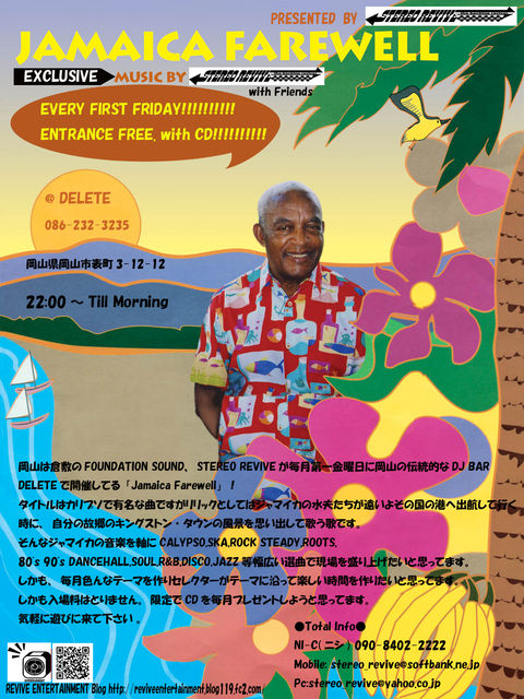 岡山は倉敷のFOUNDATION SOUND、STEREO REVIVEが毎月第一金曜日に岡山の伝統的なDJ BAR DELETEでレギュラーを始めます。 タイトルは「Jamaica Farewell」! カリプソで有名な曲ですがリリックとしてはジャマイカの水夫たちが遠いよその国の港へ出航して行く時に、自分の故郷のキングストン・タウンの風景を思い出して歌う歌です。 そんなジャマイカの音楽を軸にCALYPSO,SKA,ROCK STEADY,ROOTS,80's 90's DANCEHALL,SOUL,R&B,DISCO,JAZZ等幅広い選曲で現場を盛り上げたいと思ってます。 しかも、毎月色んなテーマを作りセレクターがテーマに沿って