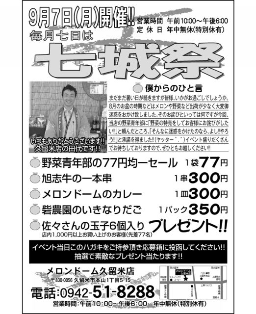 9月の『七城祭』は野菜青年部を呼んでの、ちょいと大きめのイベントばします!! イベント盛りだくさんで、しますけんが来てはいよ