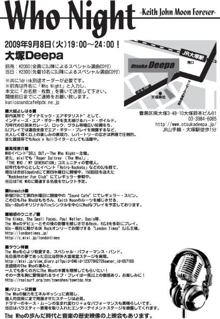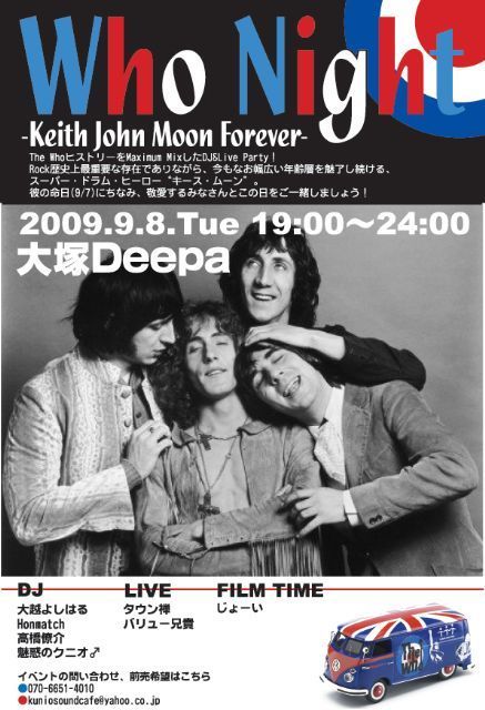 お世話になっております。 The WhoヒストリーをMaximum MixしたDJ&Live Party、第二回開催のお知らせです! こちらもRock歴史上最重要な存在でありながら、今もなお幅広い年齢層を魅了し続ける、 スーパー・ドラム・ヒーロー“キース・ムーン”。 彼の命日(9/7)にちなみ、敬愛するみなさんとこの日をご一緒出来れば幸いですよ。 “Who Night” 〜Keith John Moon Forever〜 日時:9/8(火)19:00〜24:00! 会場:大塚Deepa 03-3984-6085 住所:豊島区南大塚3-49-10大塚鈴本ビルB1 http://www.otsukadeepa.jp/ 前売:\2000(