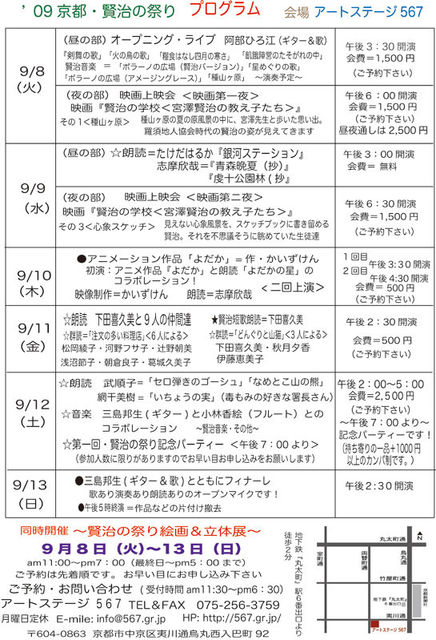 9月は宮沢賢治の命日月(賢治忌)です!地元花巻市では盛大に「賢治祭」が行われ、まさに賢治の”聖地”となっていますが、この京都にも<賢治の聖地>があります。 比叡山・延暦寺・根本中堂横に賢治の歌碑がありますが、ここで毎年賢治の命日である 9月21日に「賢治忌法要」が行われている 関西の賢治フアンにとっては「賢治の聖地」となっている。 そのゆかりの地・京都で初めて『’09 京都・賢治の祭り』を開催いたします! 全国各地から朗読家・ミュージシャン・画家・アニメ作家など23名が集まり賢治の 世界を一週間に渡って繰り