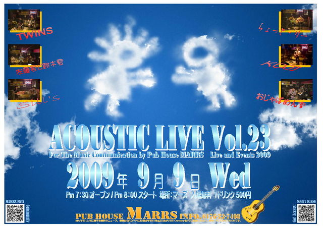 Pub House MARRS ACOUSTIC LIVE vol.23 2009年9月9日 水曜日 PM 7:30 OPEN / PM 8:00 START PUB HOUSE MARRS 入場無料 出演 ☆ちょっと・リー ☆KOJI ☆TWINS ☆佐藤君と鈴木君 ☆Sill’s ☆おじゃぱめんず 今回ももちろん入場無料 しっとり、そして熱いライブをお楽しみ下さい