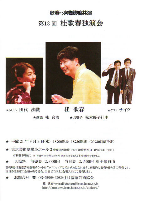 きたる9月9日(水)池袋の東京芸術劇場 にて 「第13回 桂歌春独演会」が開かれます 出演は桂歌春 、田代沙織 、M1グランプリファイナリストのナイツ 、桂宮治 日時:平成21年9月9日(水)18:00開場 18:30開演 (20:30終演予定予定) 場所:東京芸術劇場 小ホール2 入場料:前売り券2000円(全席自由) 当日券2500円原則的に前売券のみの発売です。当日券はお席の余裕がある場合、当日17:45より会場入り口にて発売致します。 チケット:東京芸術劇場 チケット&グッズ