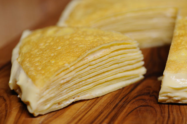 パンメニュー 「クレセント」 ドライトマトとクリームチーズの生地と、グリーンオリーブをたっぷり使いそれぞれ違ったテイストに仕上げます。 食感は先っぽがカリッ、表面サクッ、中はもっちりと面白い食感で焼き上げましょう。ツノ状に成形する作業が、とってもユニークです☆ 形はクレセント→月(十五夜)=ツノ状。。。といった感じです。 ※お持ち帰りそれぞれ2ヶずつ。 軽食メニュー 「ミルクレープのいちぢくソースがけ」 本場のクレープパンを使って一枚ずつみんなで焼き上げます。 クリームはカスタードクリームに少し隠し味