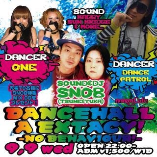 管理人様告知失礼します。 不適切でしたら削除お願いします。 月一度ジャマイ化! SNOBグランのエクスタシー! おなじみSNOB DANCEの最高峰! 9/9もさながらJAMAICAかの勢いでおおくりします! DANCERにはもはやレゲエシーンのみならずTVやBIGフェスでも 活躍のDANCE PATROL! そして今春のDANCEコンテストでは僅差の準優勝に輝くONE! 注目の2組はファンならずとも見逃せませんね〜 ”今”のジャマイカそのままに時差なしJAMAICA! 毎月好評CDプレゼントは 先着限定70名様! エクスタシーでしかもらえません! お急ぎG