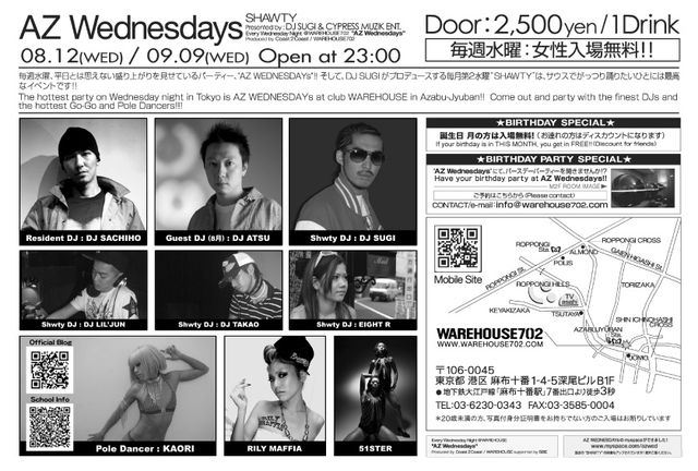 毎週水曜、平日とは思えない盛り上がりを見せているParty "AZ Wednesdays" 毎月第2水曜はDJ SUGI & Cypress Muzik Ent. Presents "Shawty" AZ Wednesdays コミュ二ティ http://mixi.jp/view_community.pl?id=1936566 ◆女性は終日入場無料◆ ◆9月生まれも入場無料◆ □■□ AZ Wednesdays "Shawty" □■□ Presented by : DJ SUGI & Cypress Muzik Ent. Supported by : Trap Starz, Explosion, 54, Uncut Flava & Glam Star ☆9/9 (Wed) @ 麻布十番 Warehouse702 ☆Open 23:00 ☆Entrance Fee Ladies : FREE Gentle