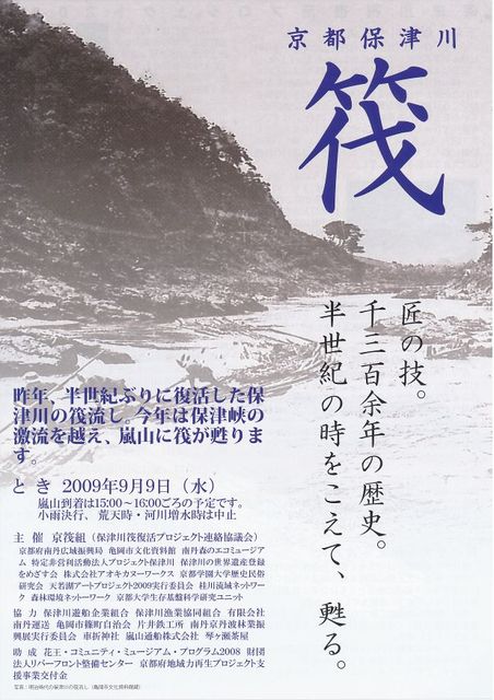 今年もやります! 筏流し。 今年は2回。 イベントと長距離と。 第1回 7月25日(土) イベント 保津浜にて ⇒ 残念ながら、増水と雨天の予報の為、中止 第2回 9月 9日(水) 長距離。保津峡から嵯峨嵐山まで! 来る9月9日(水)、昨年に引き続き筏流しを実施します。 今度は保津峡駅の少し下流から渡月橋まで流します! 詳細チラシは下記よりダウンロードしてください。 http://hozugawa.org/ikada/ikada_2009_tirasi_01_omote.jpg http://hozugawa.org/ikada/ikada_2009_tirasi_02_ura.jpg ■保津川筏復