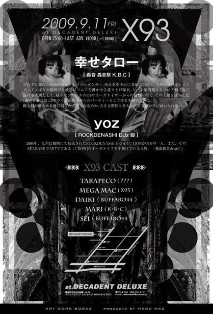 *GUEST DJ 幸せタロー(轟音 轟音祭 K.B.C) yoz(ROCKDENASHI DJz 脚) *CAST TAKAPECO(???) mega mac(x93) DAIKI(Buffaro44 ) SEI(Buffaro44 ) *OPEN 23:00 *CHARGE 1000+1d 幸せタロー【K.B.C/轟音/轟音祭】 言わずと知れた福岡が誇るクレイジーダンサー。西日本を中心に各地に出没し、メキシコの水とインディアンばりの雄叫びを武器にフロアを沸かせる盛り上げ隊長。 シーン黎明期よりフロア側で遊び続ける人間として、様々なジャンルのDJやオーガナイザーからの信頼も厚く、その人脈を活かした「