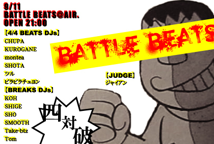 金曜の夜に親不孝通りで1000円ポッキリで楽しめるパーティーを開催!! 〜世界中のダンスミュージックフリーク達よ、集結せよ!!〜 9/11(金) BATTLE BEATS@AIR. OPEN 21:00 FEE 1000YEN -4/4 BEATS DJs- CHUPA KUROGANE montea SHOTA ビラビラ★チェヨン ツル -BREAK BEATS DJs- KOH SHIGE SHO SMOOTH Take-btz TOM -JUDGE- ジャイアン THANKS by BIG LOVE、九州力、URBAN CHAMPION、ニュー舞鶴ハリウッド、DOG RACE、瞬極殺 4/4BeatsとBreakBeats、世界中のダンスミュージックのBeatは、