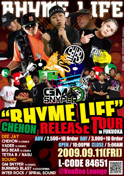 2009.9.11 (FRI) @VooDoo lounge SPIRAL SOUND ENTERTAINMENT presents. CHEHON "RHYME LIFE" RELEASE TOUR IN FUKUOKA ADV/2,500+1d DAY/3,000+1 L-CODE 84651 OPEN / 10;00PM CLOSE / 5:00AM -DeeJay- CHEHON fr.Osaka / VADER fr.Osaka / BIG BEAR fr.Osaka / Tetra B / NASU -SOUND- GM SNYPER fr.Osaka / BURNING BLAST fr.KAGOSHIMA / INTER ROCK / SPIRAL SOUND CHEHONメジャー初フル・アルバム"RHYME LIFE" RELEASE TOUR IN FUKUOKA開催決定!! -HP- http://ip.tosp.co.jp/i.asp?i=spiralsound_ -BLOG-