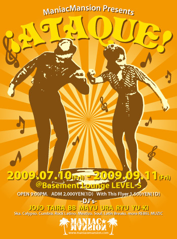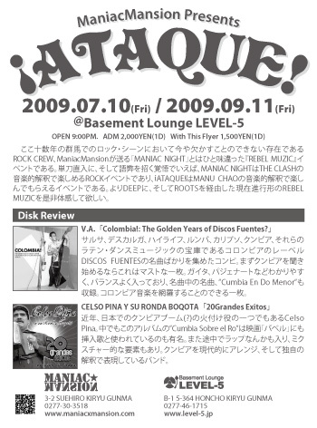 ここ十数年の群馬でのロック・シーンにおいて今や欠かすことのできない存在であるROCK CREW、ManiacMansionが送る「MANIAC NIGHT」とはひと味違った『REBEL MUZIC』イベントである。単刀直入に、そして語弊を招く覚悟でいえば、MANIAC NIGHTはTHE CLASHの音楽的解釈で楽しめるROCKイベントであり、¡ATAQUE!はMANU CHAOの音楽的解釈で楽しんでもらえるイベントである。よりDEEPに、そしてROOTSを経由した現在進行形のREBEL MUZICを是非体感して欲しい。 ManiacMansion Presents... 『¡ATAQUE!』 2009.09.11(fri) @Basement Loung