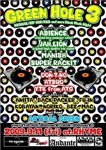 管理人様告知失礼します。 9 / 11 (FRI) 【GREEN HOLE vol.3】 @RHYME START / 21:00 ADV / 1500yen-1d DOOR / 2000yen-1d 〈REGGAE SIDE〉 ASIENCE JAH LION MANISH SUPER RACKIT 〈HIP HOP SIDE〉 DON T NO ATSUO YTK(ATG) 〈RUB-A-DUB〉 ANIITA BACK PACKER FU-IN KOBAYAN NORIKO BEE MAC(ATG) 〈HOST SOUND〉 ARTICAL GREEN -INFO- ARTICAL GREEN 1-LOW 090-5703-9244