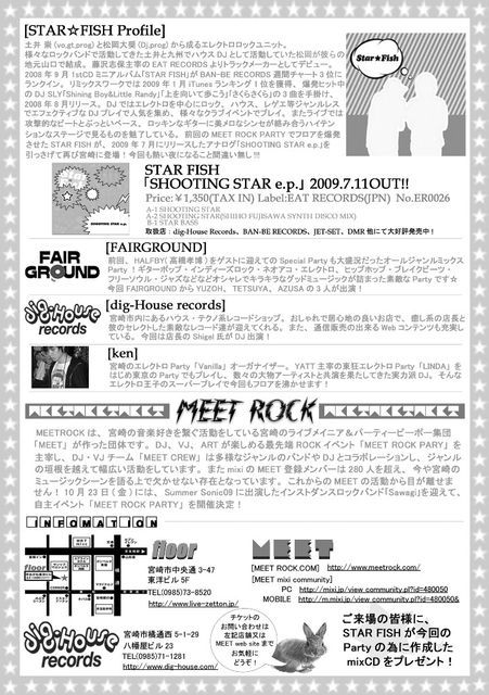 今回はMEETROCK SPECIAL NIGHT!と題して、前回4月に開催されたMEET ROCK PARTYのDANCE STAGEのメインゲストとしてフロアを爆発させたエレクトロユニット「STAR FISH」の新曲リリースパーティーを開催します。