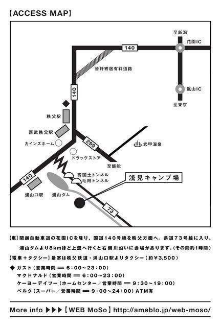 管理人様、コミュの皆様、告知失礼致します。 もし内容が不適切でしたらお知らせください。削除させていただきます。 音楽プロデューサーや作曲家、ファッションディレクターに演出家など、 各界のプロフェッショナルたちで構成される集団・MoSo。 過去にクラブイベントをはじめ、ビーチを舞台にしたISO MoSo(磯妄想) や、禅寺を舞台にしたTERA MoSo(寺妄想)など、 DJを軸に、バラエティーに富んだ数々のイベントを開催してきました。 今回は、知る人ぞ知る穴場キャンプ場、埼玉秩父・浅見キャンプ場を舞台に した野外イベント。題し