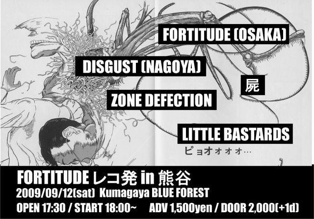 9/12 (土) 熊谷BLUE FOREST http://www.blueforest-kumagaya.com/ FORTITUDE レコ発 in 熊谷 FORTITUDE (大阪) DISGUST (名古屋) ZONE DEFECTION 屍 LiTTLE BASTARDS open 17:30 / start 18:00 ADV \1,500 / DOOR \2,000 (+ 1Drink)