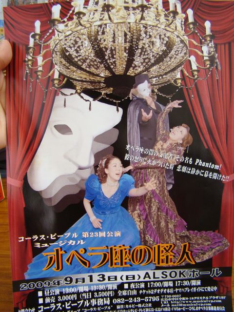 オペラ座の怪人 日時: 9/13(日) 昼の部→開場13:00 開演13:30 夜の部→開場17:00 開演17:30 場所: アルソックホール(旧郵便貯金ホール) チケット:前売り券(3000円) 当日券(3500円) チケットは、もみじが持っていますで、私まで、お買いお求め下さいませ ミュージカル鑑賞後は、 もみじの輪の皆さんで、毎年の如く、お食事会をお楽しみ下さい