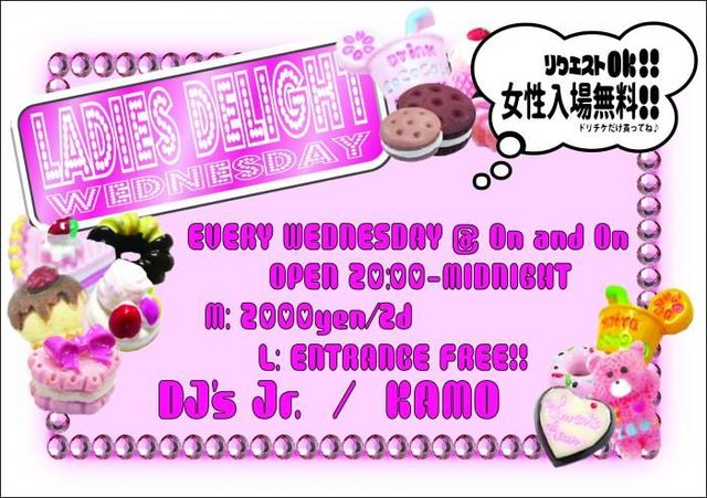 管理人様、告知失礼します 本日女性入場無料ですよみんなで梅田On and Onに遊びに行こうよ LADIES DELIGHT WEDNESDAY DATE: 9月16日(水) TIME: 20:00 ~ LATE 20:00〜3:00まで PRICE: M2000- 2D L FREE(要D) GENRE: Disco/Dance/Hip Hop/R&B/Reggae/Trance/Mix DJ: Jr. http://www.iflyer.jp/artist/66 DJ KAMO http://www.iflyer.jp/artist/65 毎週水曜日は女性入場無料 毎週水曜日は女性入場無料&3:00まであなたの聴きたい曲をA