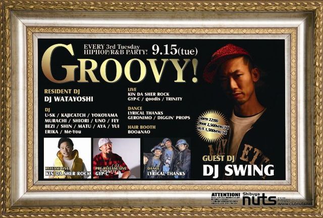 告知失礼します ■9/15(火)"GROOVY!" @渋谷nuts open 22:00 2,500yen 1drink/ w.f. 1,000yen off http://www.clubnuts.net/ 【GUEST DJ】 DJ SWING http://mixi.jp/view_community.pl?id=434792 【DJ】 WATAYOSHI, U-SK, KAJICATCH, YOKOYAMA, MURACHI, SHIORI, UNO, FEY, BEZI, SHIN, MATU, AYA, YUI, ELICa, Me-You 【LIVE】 KIN DA SHER ROCK, GYP-C, goodis, TRINITY 【DANCE】 LYRICAL THANKS, GERONIMO, DIGGIN' PROPS お名前と人数を添えてメッセージを送って頂ければゲスト料金→1500/1Dにします