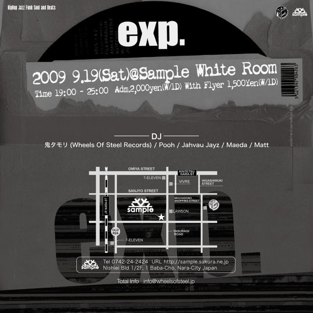 管理人様 失礼致します。イベントの告知をさせて頂きます。 『exp.』Vol.6 HipHop Jazz Funk Soul and Beats 2009 9.19(Sat)@Sample White Room Time 19:00 - 25:00 Adm.2,000yen(W/1D) With Flyer 1,500Yen(W/1D) ■DJ 鬼タモリ(Wheels Of Steel Records) Pooh Jahvau Jayz Maeda Matt ■Total Info info@wheelsofsteel.jp 【Sample】 〒630-8354 奈良市馬場町 1番地 西栄ビル1/2F TEL 0742-24-2424 URLhttp://sample.sakura.ne.jp/ 皆様、ぜひ足をお運び下さいませ。